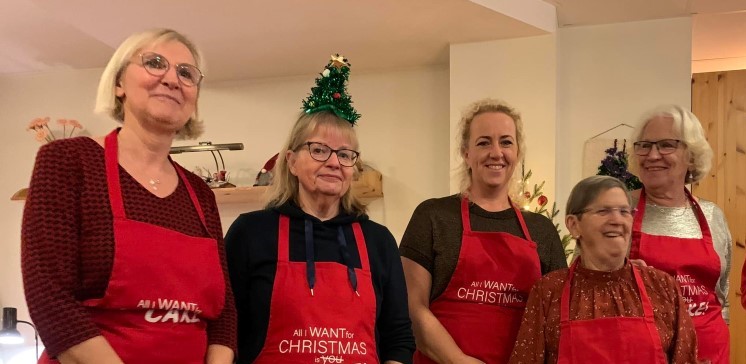 Julaftengjengen: Denne gjengen med ildsjeler skapte en fin ramme rundt julaftensfeiringen i LHL-bygget på Bjørkelangen. Fra venstre: Tordis Erikstad, Elisabeth Rye, Gro Anita Kversøy, Ann Ottesen, Inger Heggen Olsen og nissefar. Foto: Rita B. Lindblad