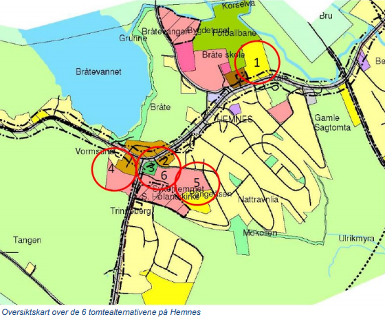 Administrasjonen har presentert syv alternative tomter for omsorgsboliger på Hemnes. I februar foreslo kommunedirektøren å bygge omsorgsboliger på den tomten som Hemnes sykehjem står på. Det ønsket ikke politikerne, derfor faller dette nå bort som tomtealternativ. Administrasjonen anbefaler nå at omsorgsboligene bygges på denne tomten i Hemnes sentrum, der det nå er parkeringsplass (se kart under).